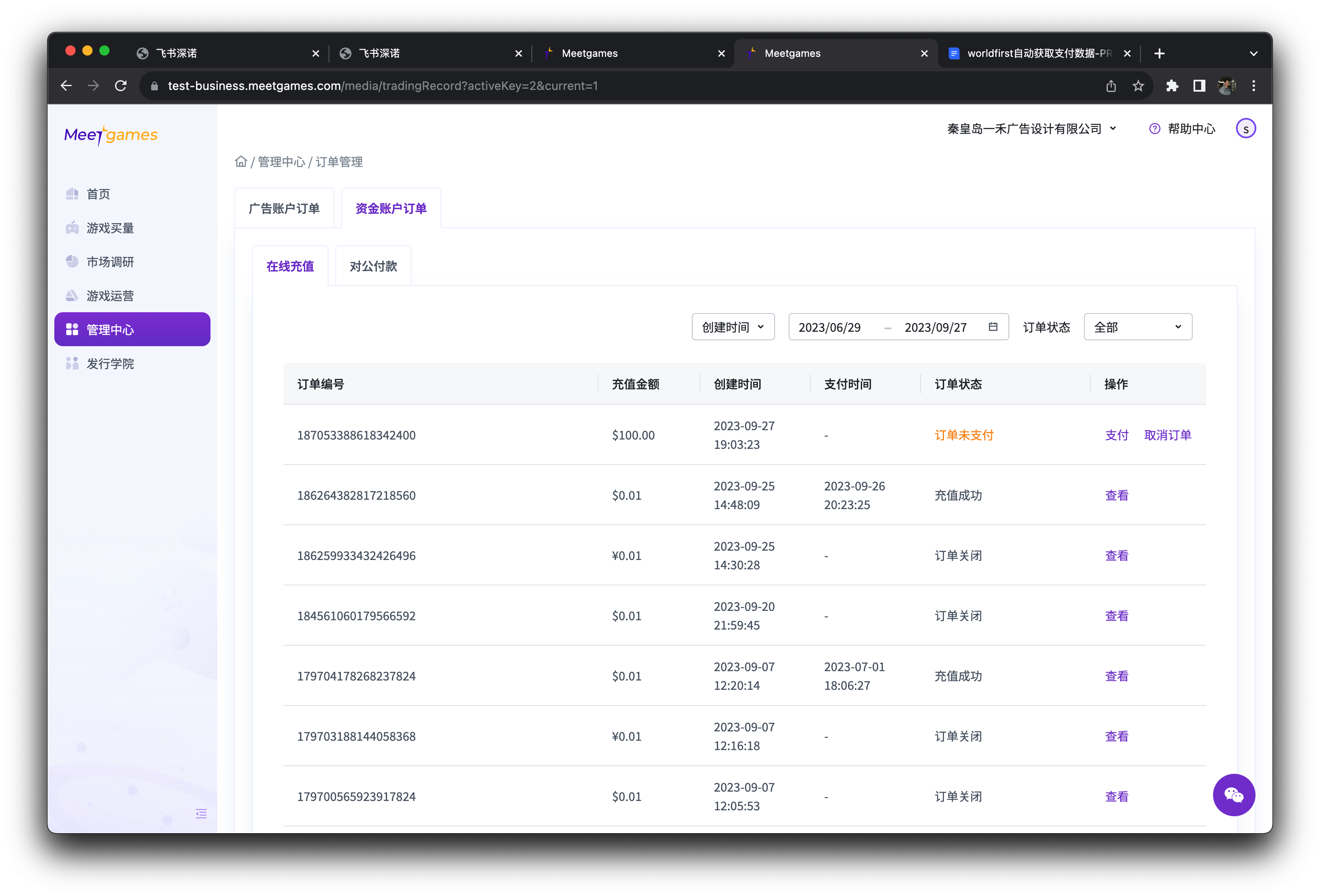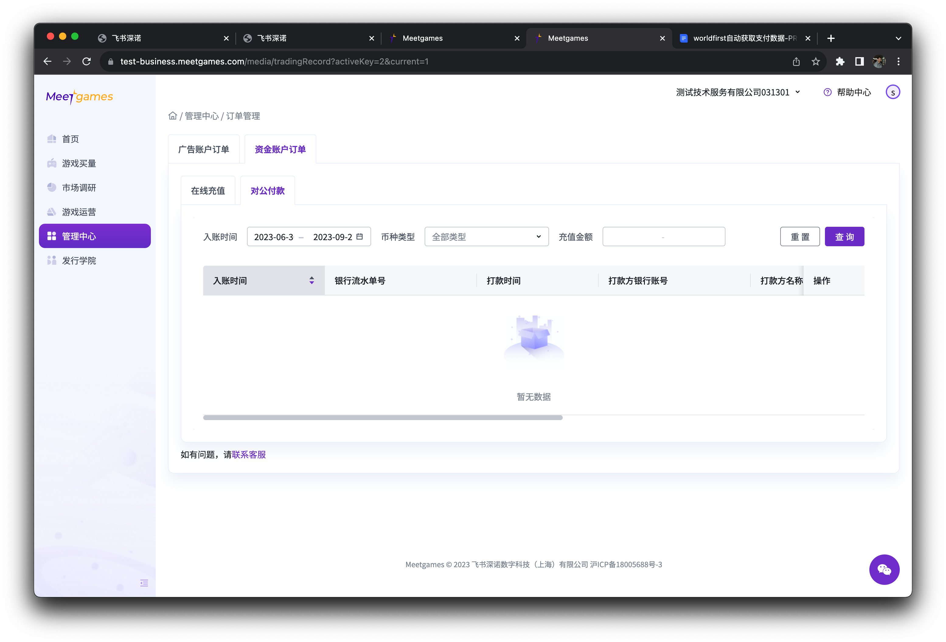 您可以在订单管理-资金账户订单-对公付款页面查看对公转账记录(图9)。