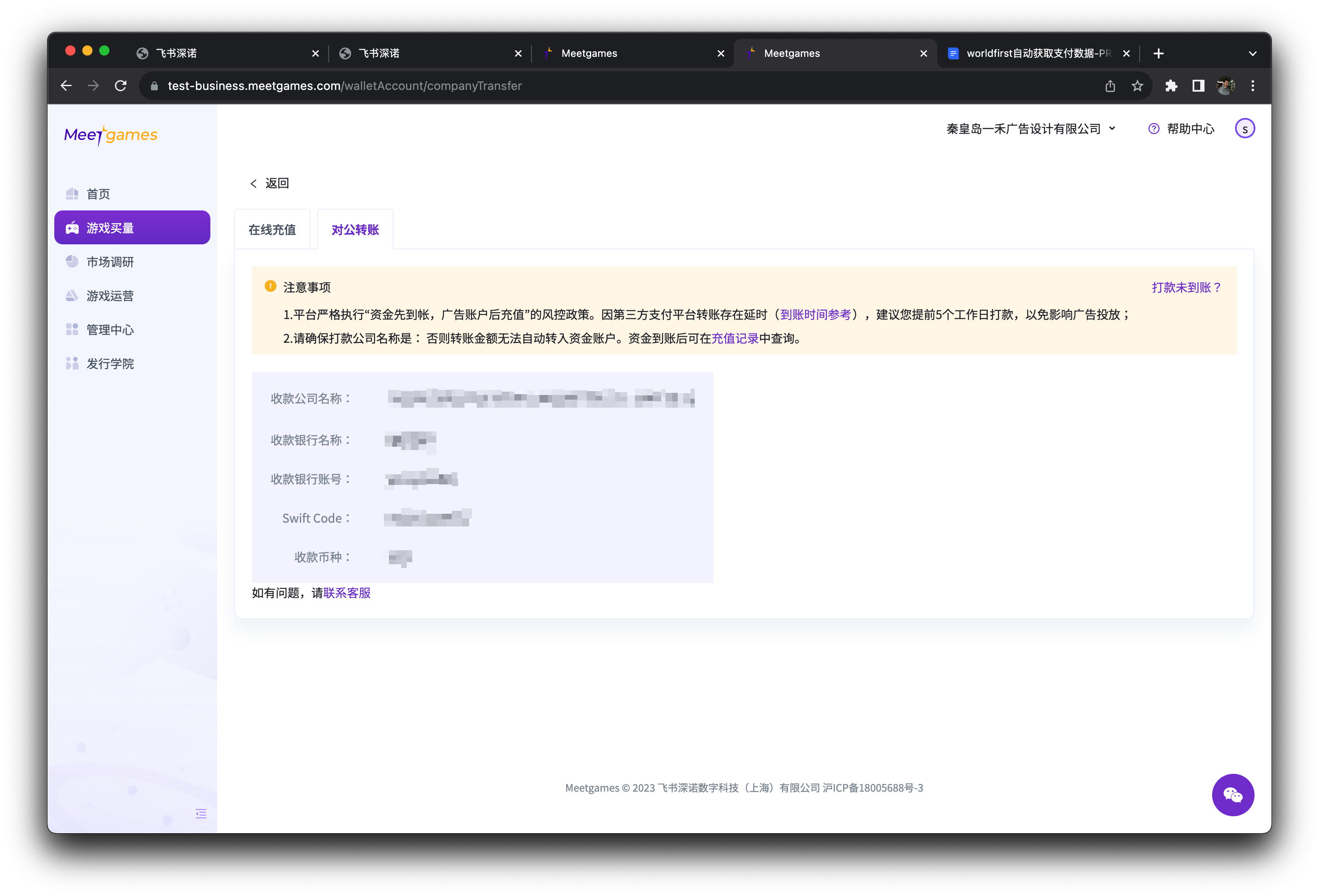 若您已经获取飞书为您分配的收款账号(会在页面中直接显示),直接往您的收款账号中对公付款即可。您需要注意对公转账的到款时间,以免影响广告投放。到款时效