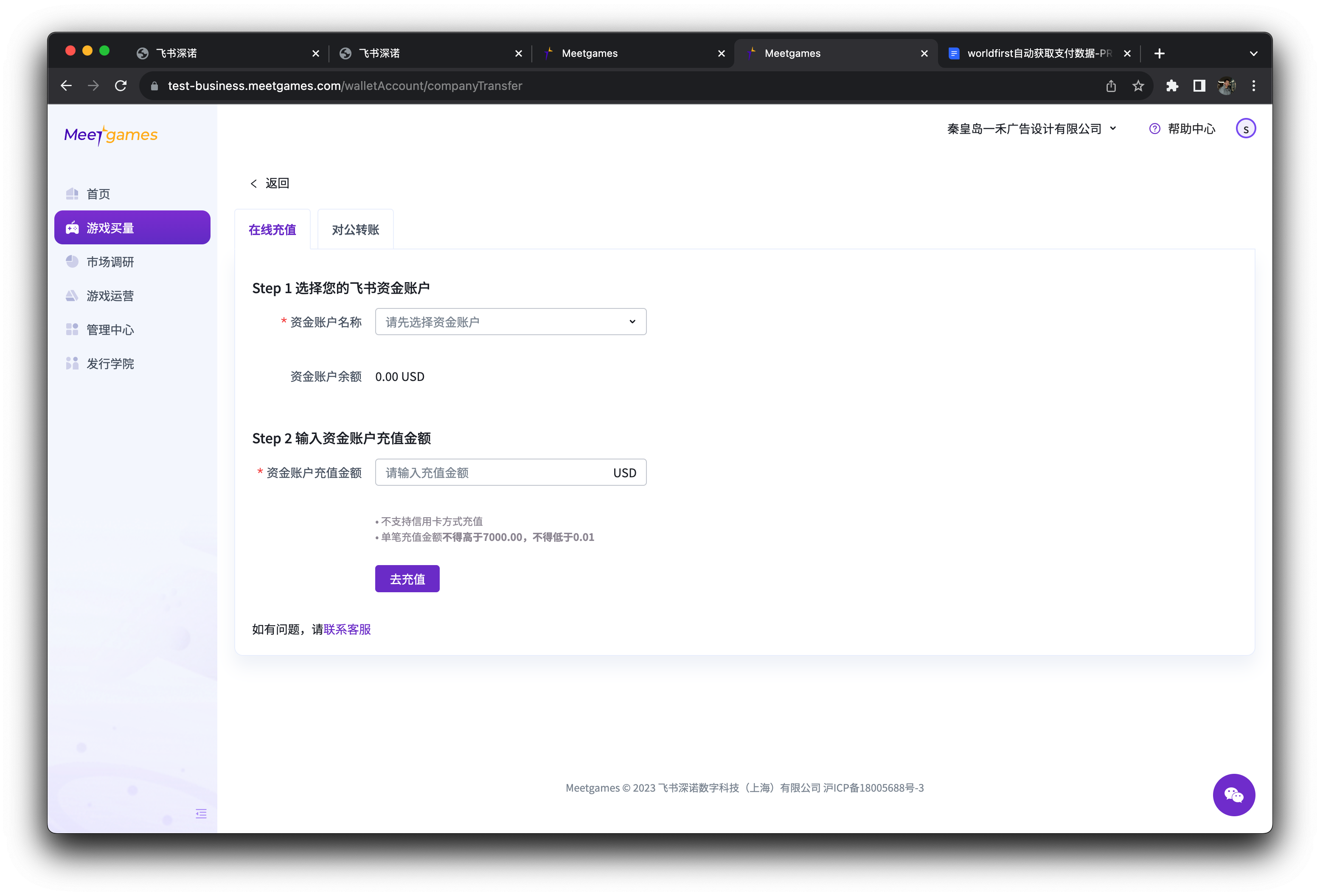 二、飞书资金账户充值