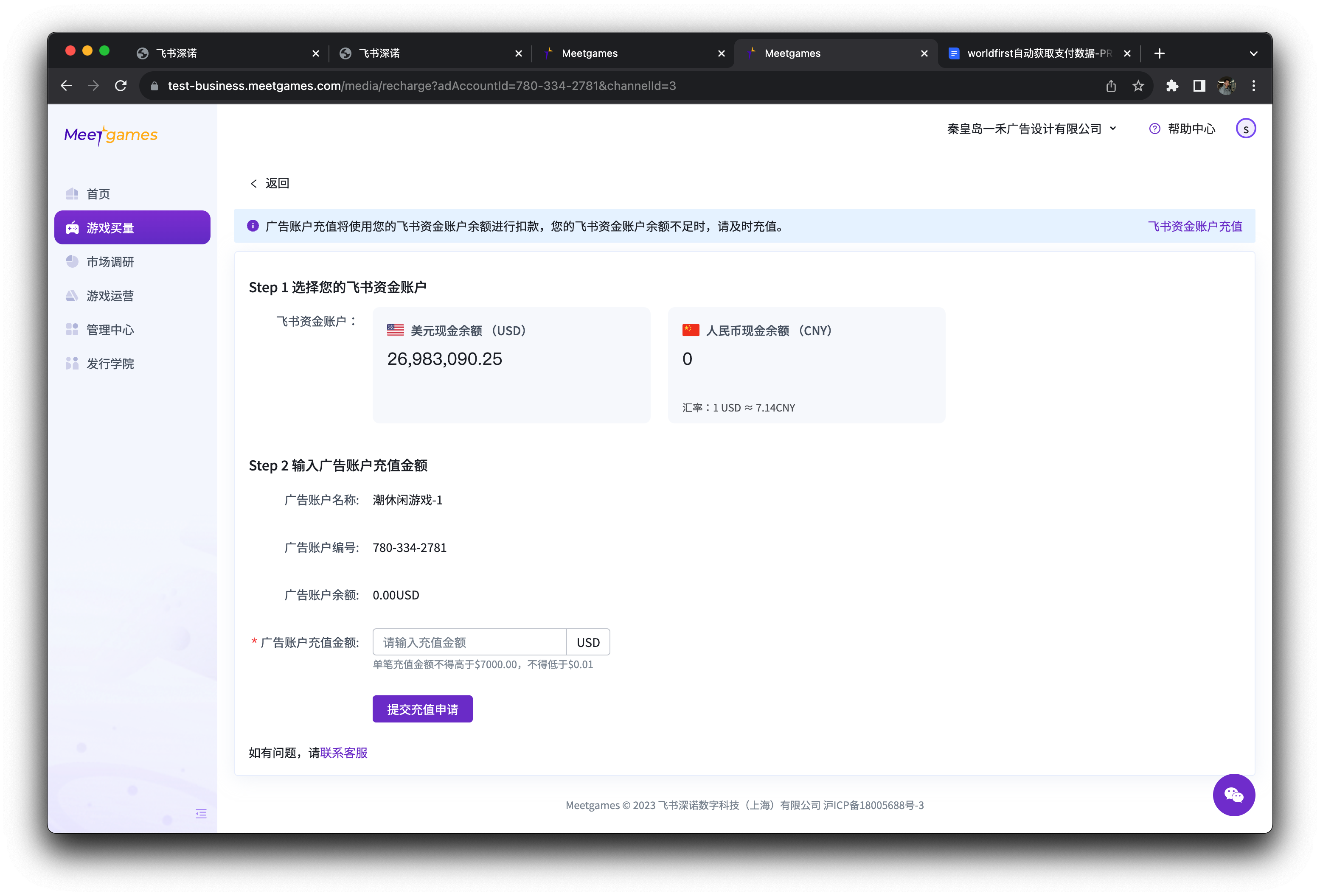 选择您的飞书资金账户,输入需要往媒体账户充值的金额后,点击提交充值申请即可完成充值操作。