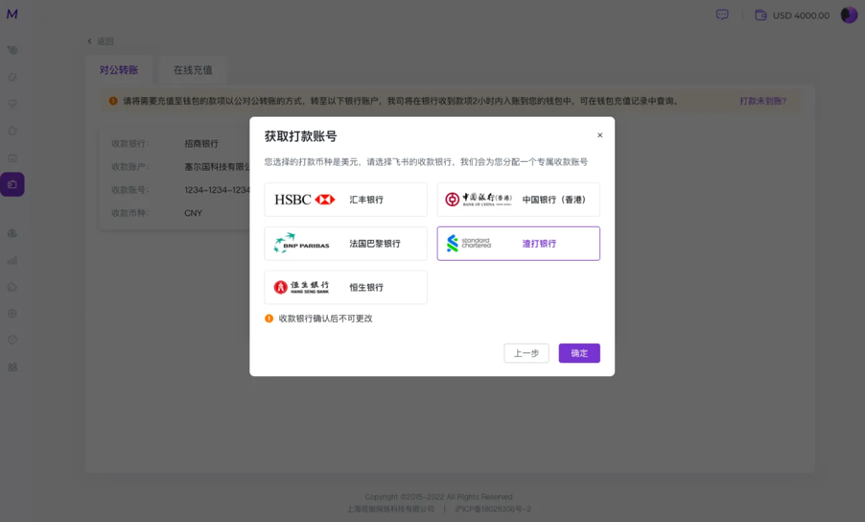2. 若您选择的币种为美元,需选择飞书的收款银行(图8)。