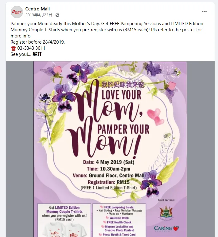 例如购物中心Centro Malla在Facebook上发帖:“在母亲节这天宠爱母亲。来领取免费的宠爱季节限定和限量版亲子套装……”