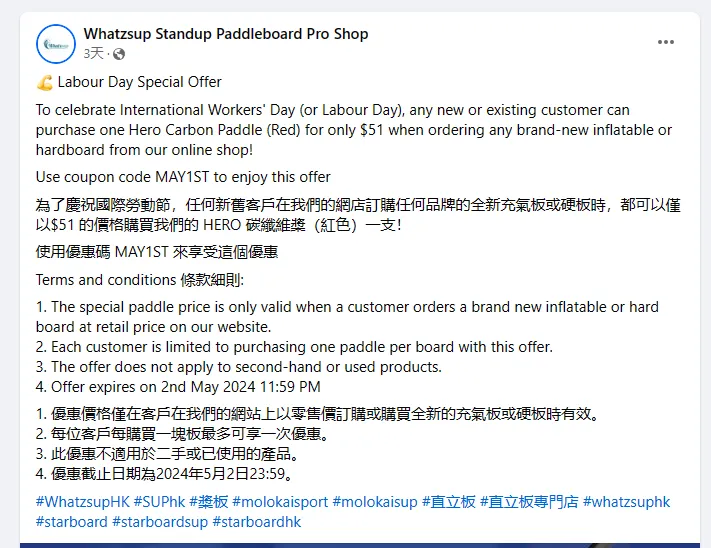 No.4 51的折扣:在5月1日这天,也有品牌推出51%折扣,或者推出51元的特价商品,吸刺激消费转化。例如下图的船桨品牌Whatzsup,在今年五一期间推出了51美元换购商品的活动。