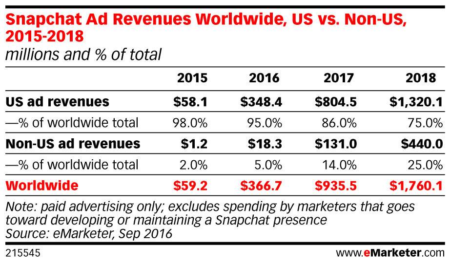 Snapchat的用户数量巨大,并且比Facebook更年轻,以18-24岁的用户为主,并且活跃度很高,每天分享自己图片和视频的用户高达60%,对于重视年轻用户的广告主来说,是最好的掘金地。所以Snapchat的广告业务发展迅速,目前的年广告收入已经达到2.5亿美元至3.5亿美元,调查公司预期明年能够增加到10亿美元。