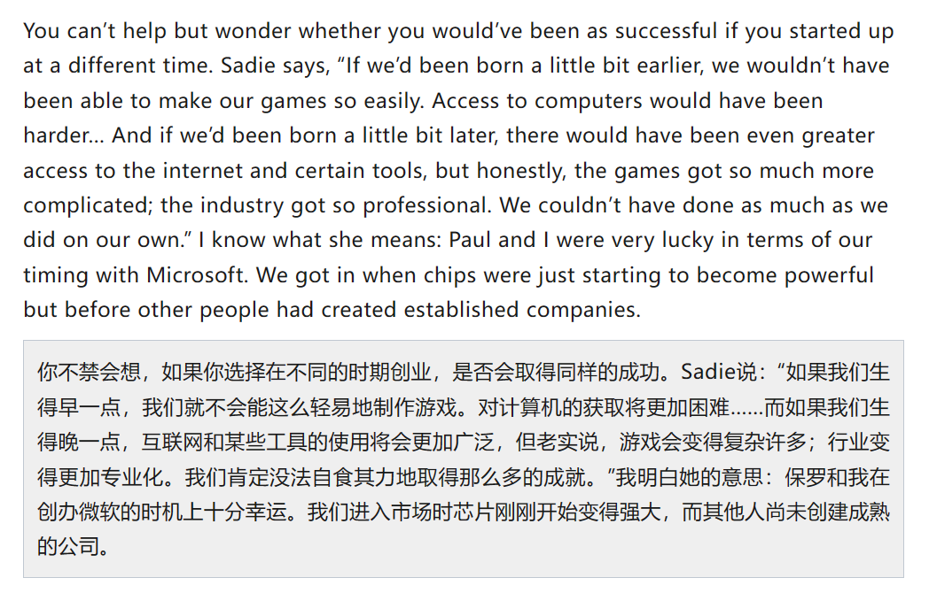 但这并不是比尔·盖茨认可《明日传奇》的原因,甚至在过去很长一段时间里,他都认为自己算不上玩家。比尔·盖茨表示,他更愿意将这本小说理解为一个讨论伙伴关系与合作的故事。在翻看小说时,他也时常回想起自己的创业经历。