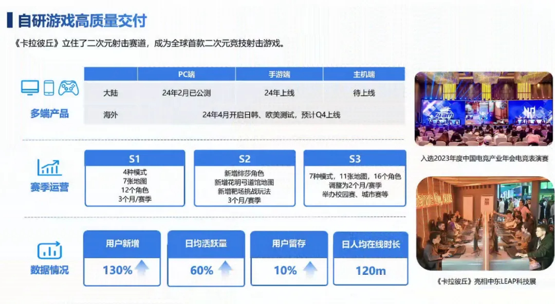 首先是,二次元射击竞技游戏《卡拉彼丘》。该游戏在2023年2月份上线PC版本。据创梦天地CEO陈湘宇业绩会透露的消息,《卡拉彼丘》PC游戏上线后表现不错,在春节的S3赛季,《卡拉彼丘》用户的增长同比提升了130%。日活跃量用户增长超过了60%,用户留存也同比提升了10%,日均在线时长超过了120分钟。