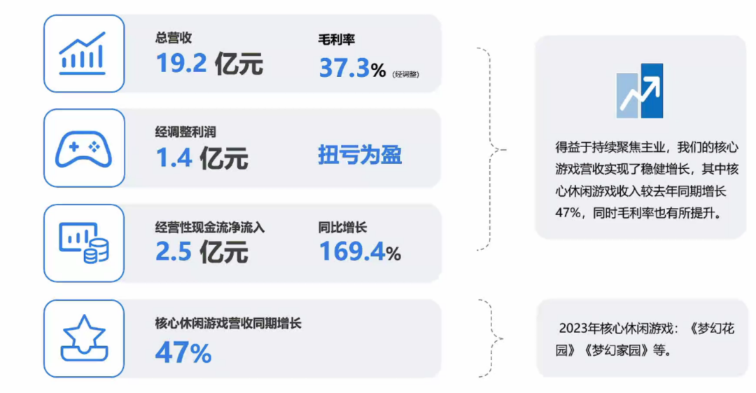 创梦天地发布了2023年业绩报告。报告显示,该公司总营收19.2亿元(人民币,下同),同比减少26.1%;经调整净利润1.39亿元,实现扭亏为盈;经营性现金流约2.5亿元,同比增长169%。