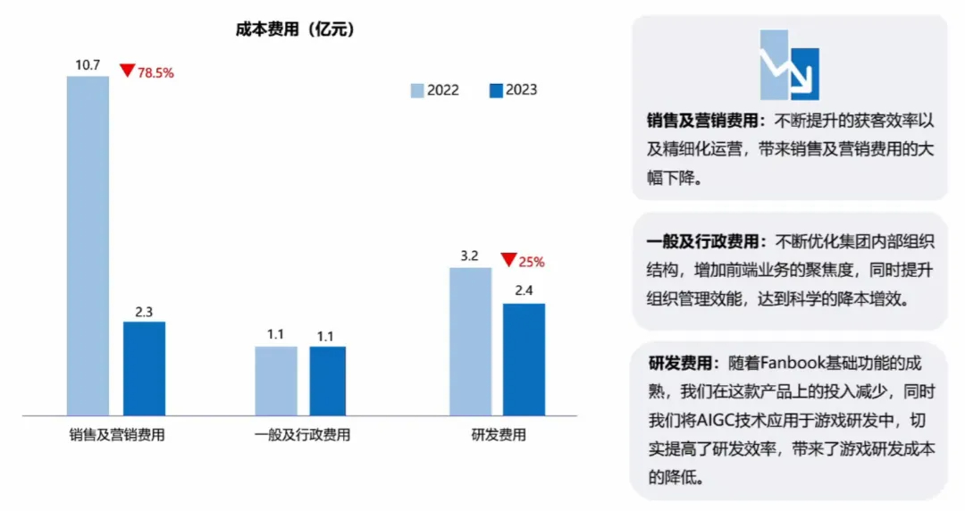 另一方面是,社区平台Fanbook进行用户运营带来自有渠道收入提升以及渠道成本的减少。据悉,2023年Fanbook的交易额超过2亿元,同比2022年增长50%;新增社区超过40000个。截至目前该平台已有超5000优质创作者,这些创作者创造的内容在此平台曝光超20亿次。