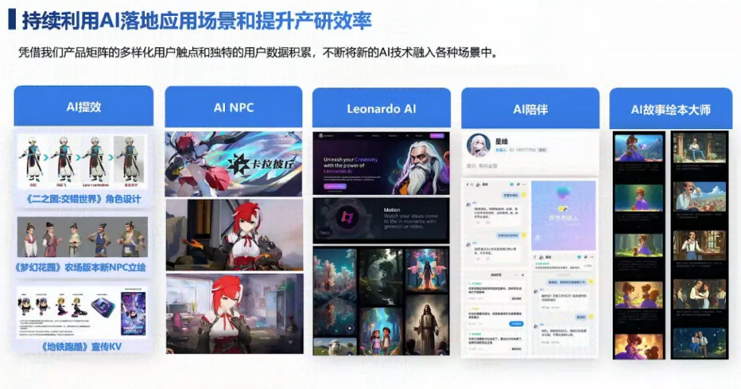 创梦天地CTO关嵩在业绩会上表示,公司今年将会落地的几个重要的AI场景:一是,《卡拉彼丘》赛季更新的地图与玩法全新的AI NPC周期性的上线;二是全球头部图像AI厂商LeonardoAI将会在近期通过Fanbook社区落地中国;三是,与百川智能合作的游戏角色智能陪伴的能力。