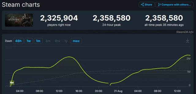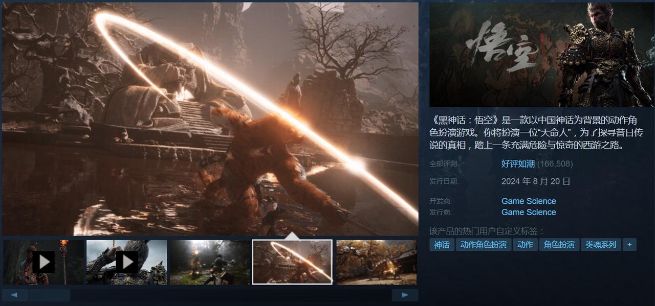 发布时间:2024-08-22 18:20:20等待多年之久的《黑神话:悟空》(下文称《黑神话》)终于在8月20日于正式上线,火爆程度不言而喻,全球54家媒体打出84分,IGN中国更是给出满分评价,并且上线不到1小时,steam榜首在线突破120万人数。在国内的成功之外,放眼海外市场,总浏览量也达到了14.1万次,荣登多个国家和地区的iOS、Android游戏下载榜单榜首。