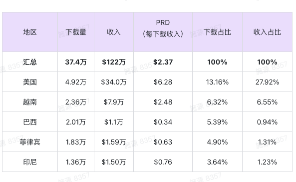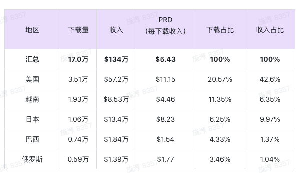 安卓端美国地区日均达到1,2000的下载量,东南亚的菲律宾和越南分别每日有5~6千下载量;