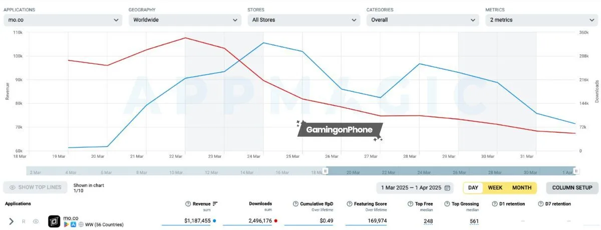 根据Sensor Tower的数据,《MO.CO》在 App Store 累计收入 47 万美元,Google Play 收入 10 万美元,其中美国、德国、法国贡献主要收入。与此同时,iOS 下载量达 85 万次,Google Play 下载量达 160 万次。这一数据并不乐观,仅为《爆裂小队》(首周1亿流水、3000万下载量)的6%和7.8%。