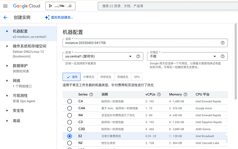 - 机器类型 (Machine type): 根据您选择的系列,选择具体的 vCPU 数量和内存大小 (RAM)。例如 e2-medium (2 vCPU, 4 GB RAM), n2-standard-4 (4 vCPU, 16 GB RAM)。您可以选择预定义类型或自定义配置。