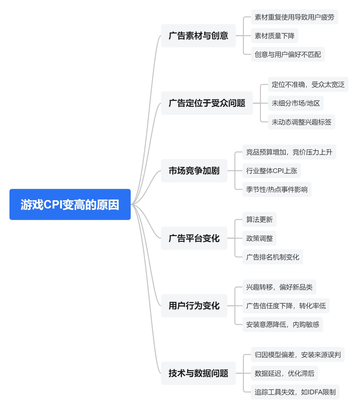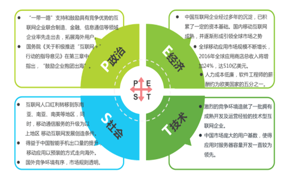 对外部的大环境进行战略分析时常用的一种方法,从政治(Political)、经济(Economic)、社会(Social)、技术(Technological) 四个维度评估外部环境对广告投放的影响。辐射到游戏出海,需要分析不同地区的最新政策,媒体投放要求变化,市场重大事件/节日/竞品等影响因素。