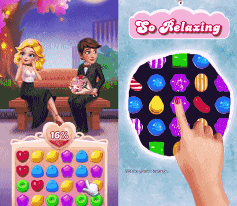 利用解压的画面开场,制造连续的爽感/反差感,让玩家感到舒适,激发对三消游戏的尝试欲望。