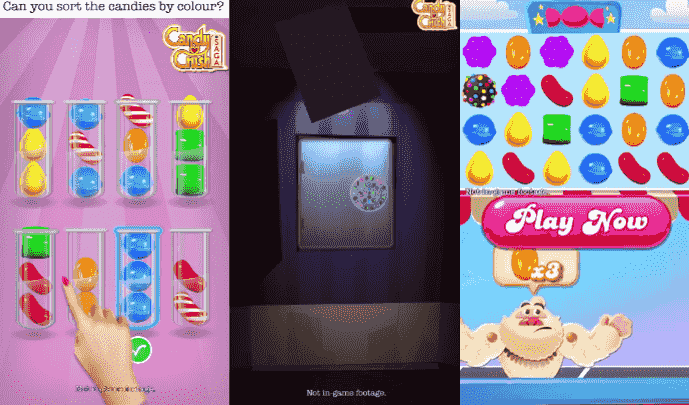 (需要注意违规,例如《Candy Crush Saga》在广告素材中会添加声明: Not in-game footgae. / Not actual Gameplay. “非游戏内画面” 或 “非实际游戏玩法”)。这种广告创意策略需要在合规和吸引力之间做好平衡。