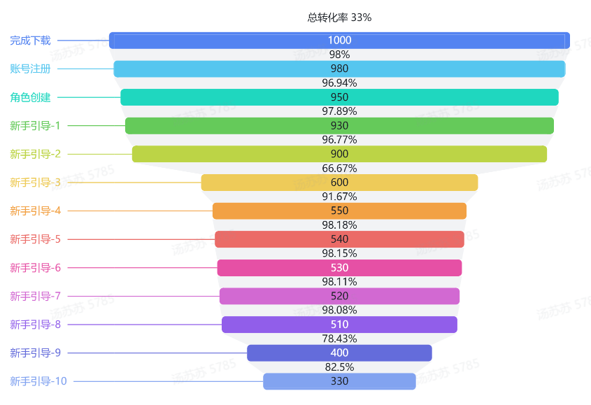 如下面是一个简单的新手引导漏斗,展示从用户下载到注册,创角,进入游戏后每一个步骤的转化,同时也能定位玩家关键的流失节点。