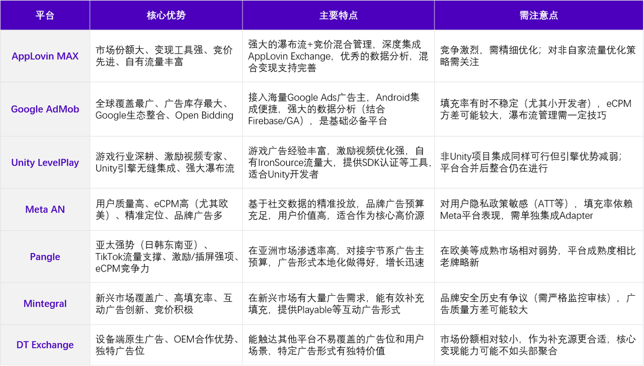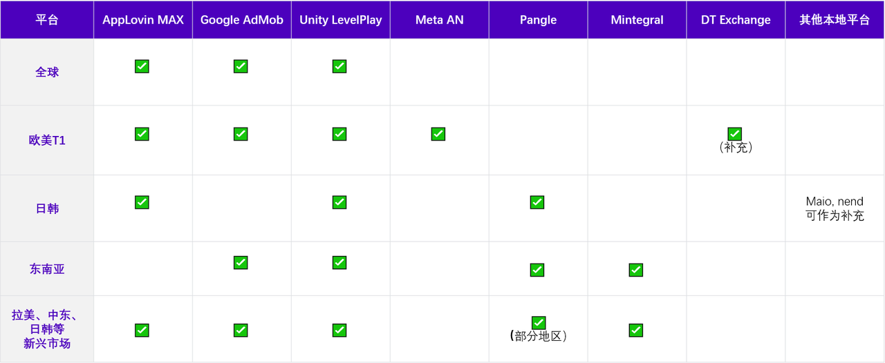 全球覆盖: AdMob, AppLovin MAX, Unity LevelPlay - 无论主战场在哪,这三个通常是必选项或至少选两个作为基础。