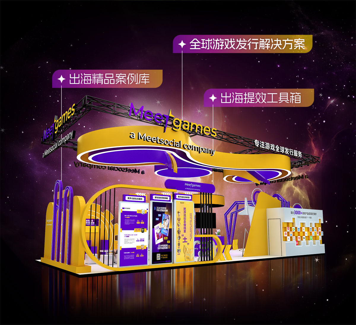 以象征服务闭环的流线型展台,呈现Meetgames的服务贯通 “研发—发行—运营” 的全周期,用立体空间诠释 “出海发行服务全链路覆盖”,提供一站式解决方案。