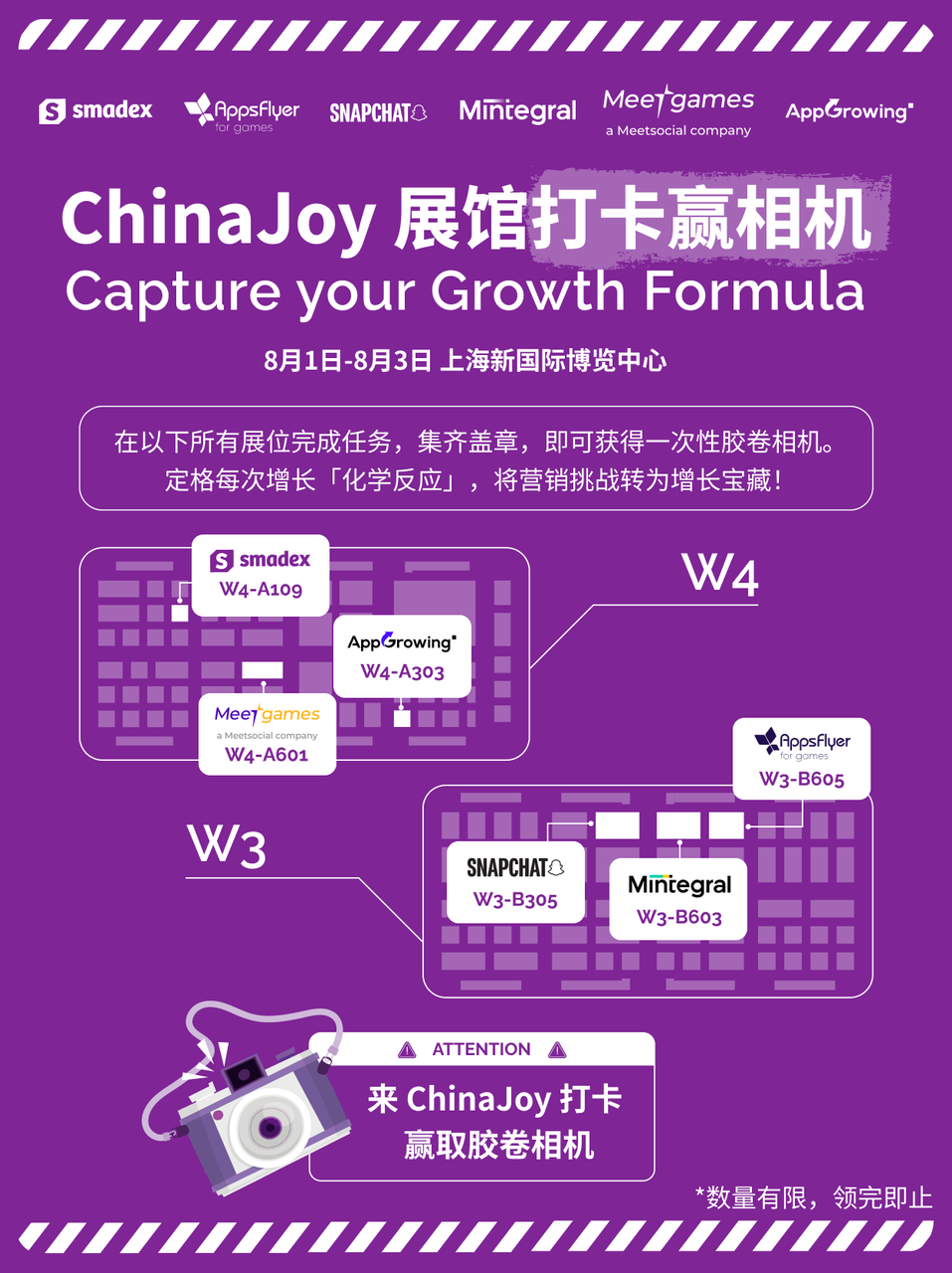 跨展位联动:携手 AppGrowing、AppsFlyer、Mintegral、Smadex、Snapchat 五大生态伙伴共同推出打卡联动,完成任务即可兑换定制复古胶卷相机,留存ChinaJoy珍贵时刻。