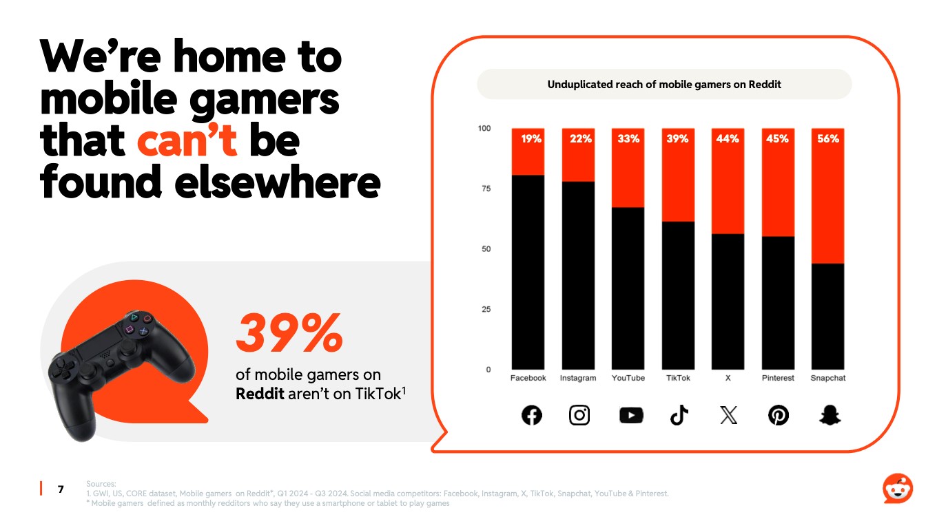 Reddit 汇聚了独一无二的手游玩家。值得注意的是,39% 的Reddit移动游戏用户并未使用TikTok,这为触达增量用户提供了宝贵机会。