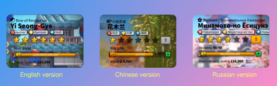 中文简洁,但翻译为外语后字符长度可能暴增。例如“战斗力”译为“Battle Power”可缩写为“BP”。建议提前通过机翻模拟UI布局,评估适配工作量。文化底蕴的跨市场传递基于《西游记》《山海经》等东方文化的游戏,若目标市场为西方国家,需重构世界观或删减高理解成本的内容(如典故、诗词)。若未做好大规模改编准备,建议谨慎选择出海区域。