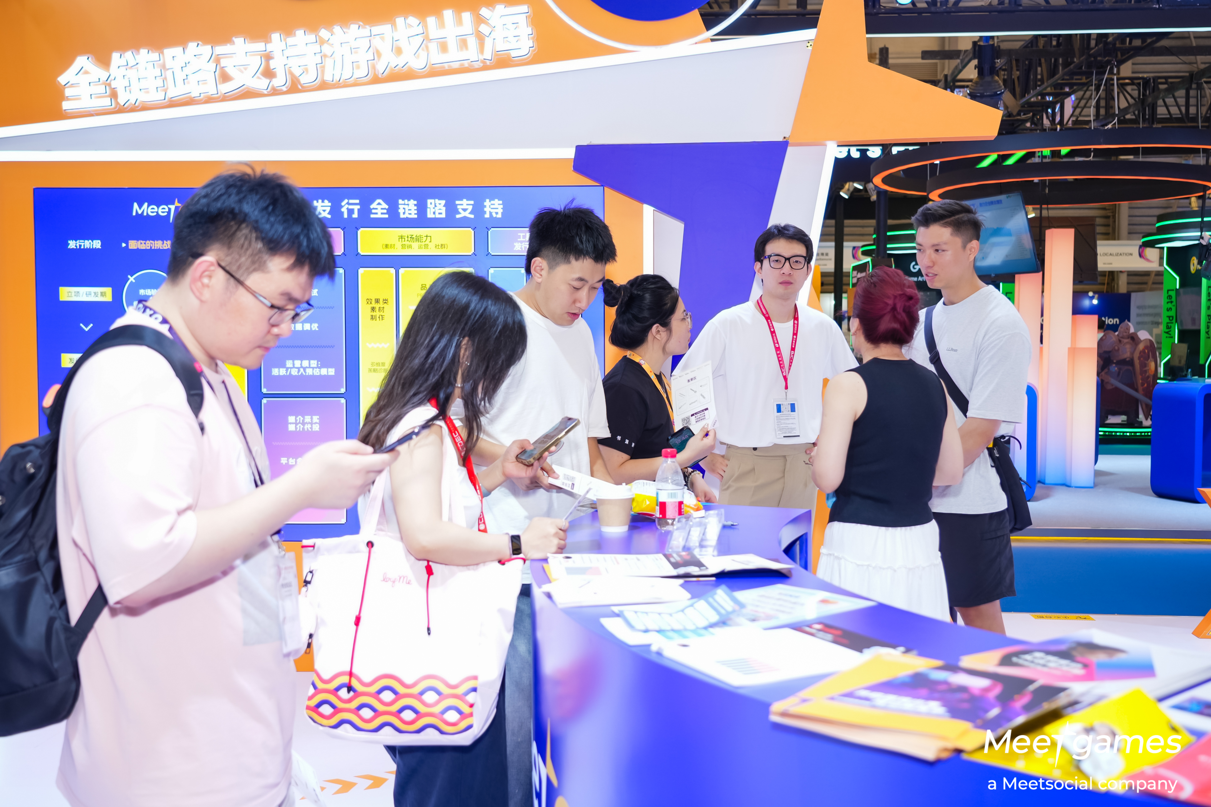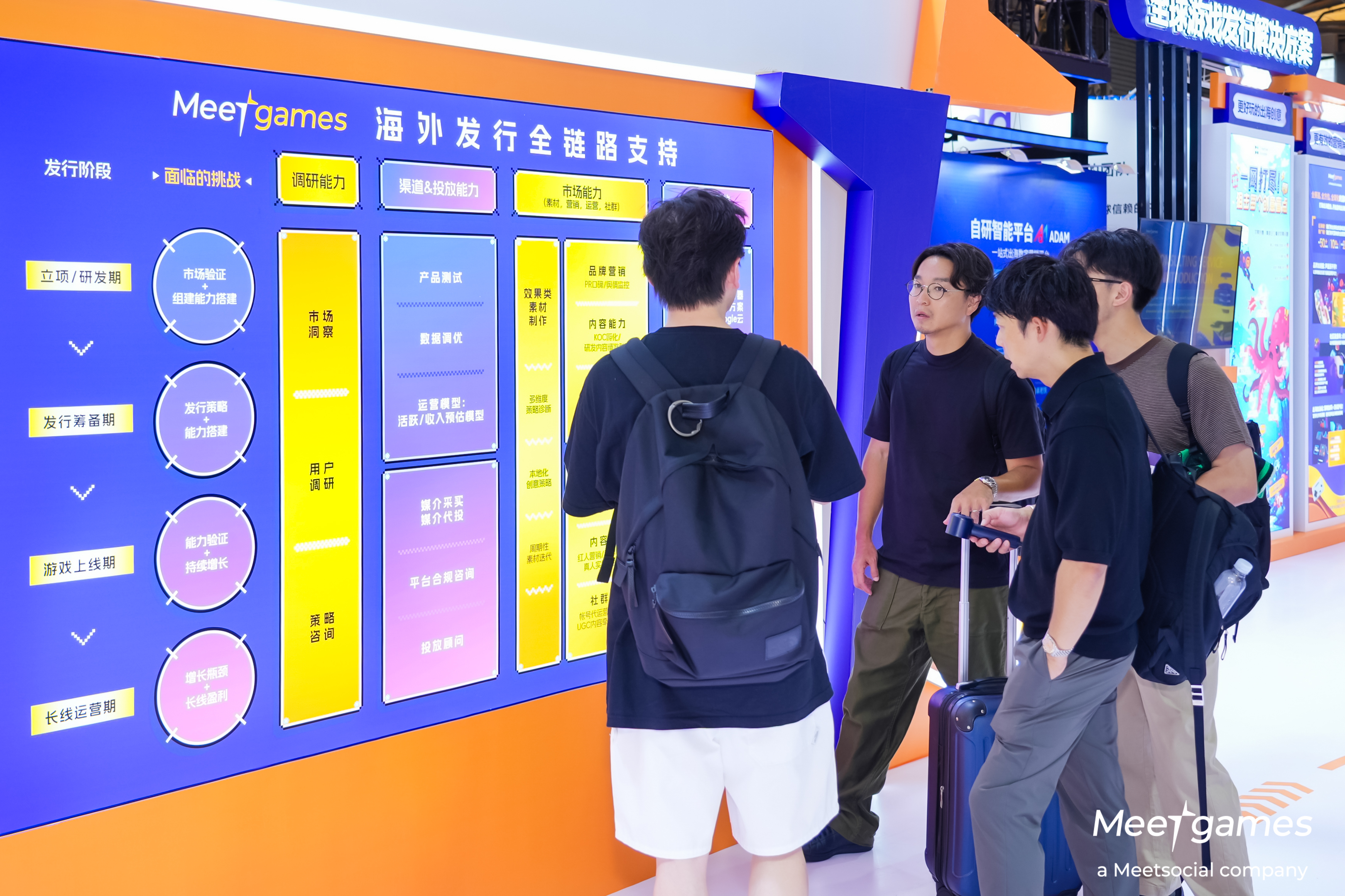 针对展台核心区域的 “全链路海外游戏发行服务” 图表,Meetgames团队与观众展开深度交流,详解从发行策略、渠道投放到全案营销、社区运营的服务细节,直观展现 Meetgames 发行服务如何赋能出海增长。