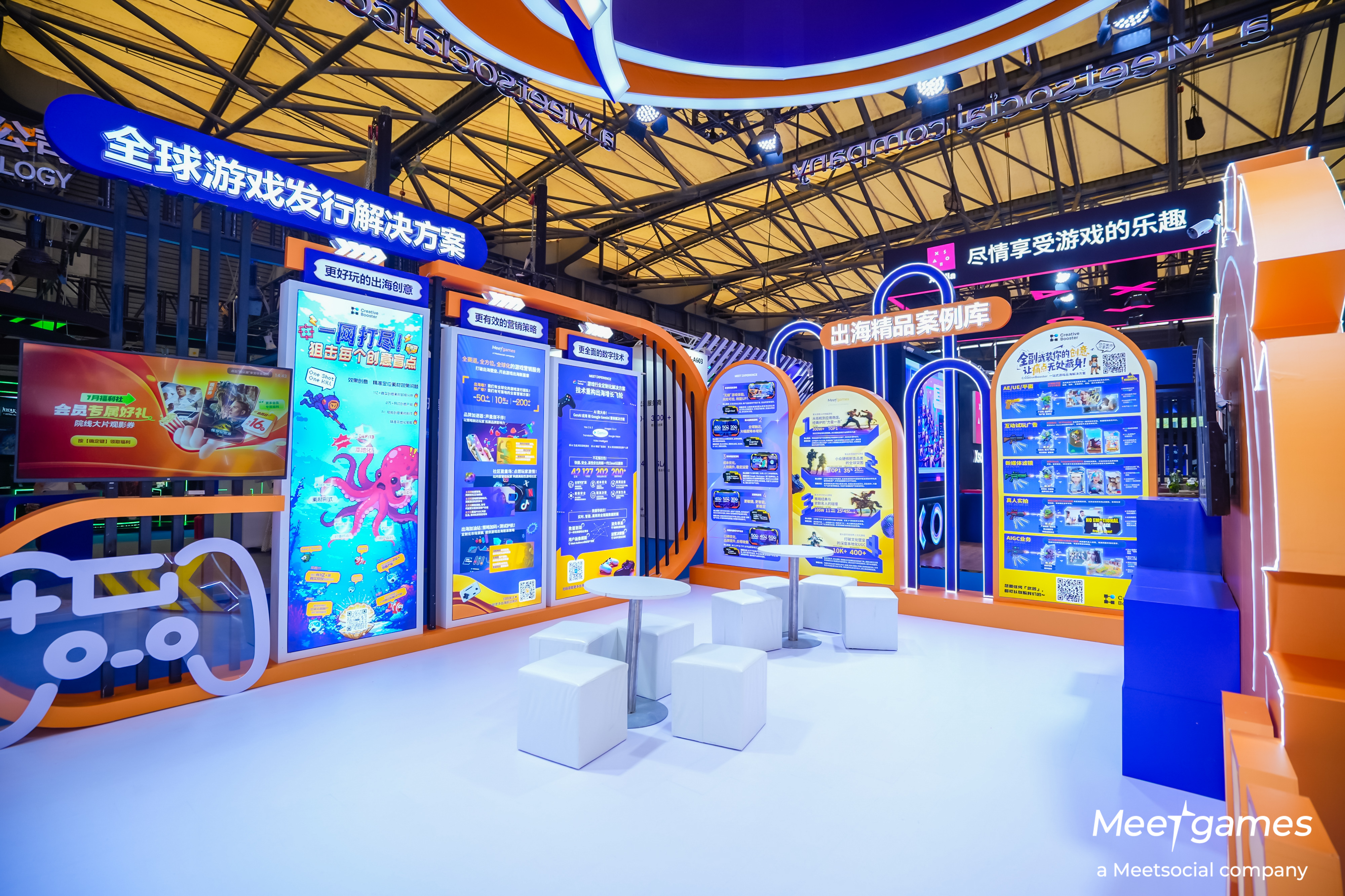 Meetgames 以“全链路游戏发行服务”为核心理念,打造了简洁大气的展台。流线型结构与分区布局相辅相成,清晰呈现 "全球游戏发行解决方案"" 出海精品案例库 ""出海提效工具箱" 三大功能板块。