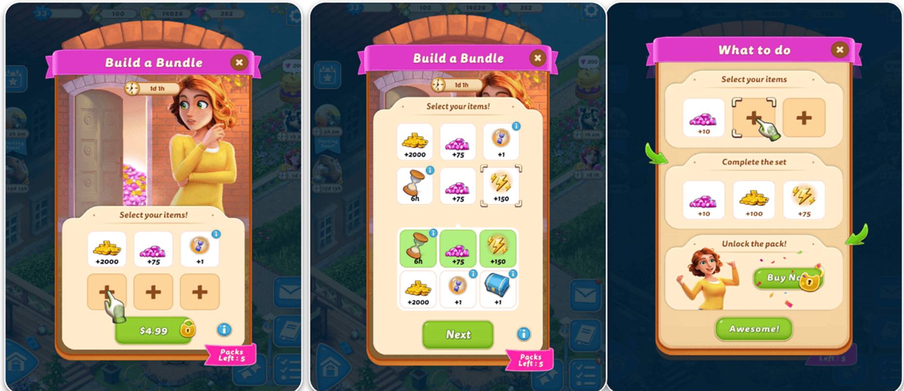 芬兰开发商 Metacore 的《Merge Mansion》率先将中核级的可定制捆绑包移植至休闲游戏。其“Build-Your-Own Bundle”包含六个道具插槽,其中三格为必备资源,另三格供玩家自由挑选。玩家最多可同时购买五份该捆绑包,既满足了核心经济需求,又保留了足够的自主空间。这种平衡设计被证明能够显著提高付费转化和重复购买率。