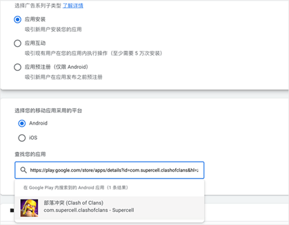 选择子类型:根据阶段需求选择UAC(拉新)、ACp(预热)或ACe(促活)。,绑定游戏商店链接(Android/iOS)。