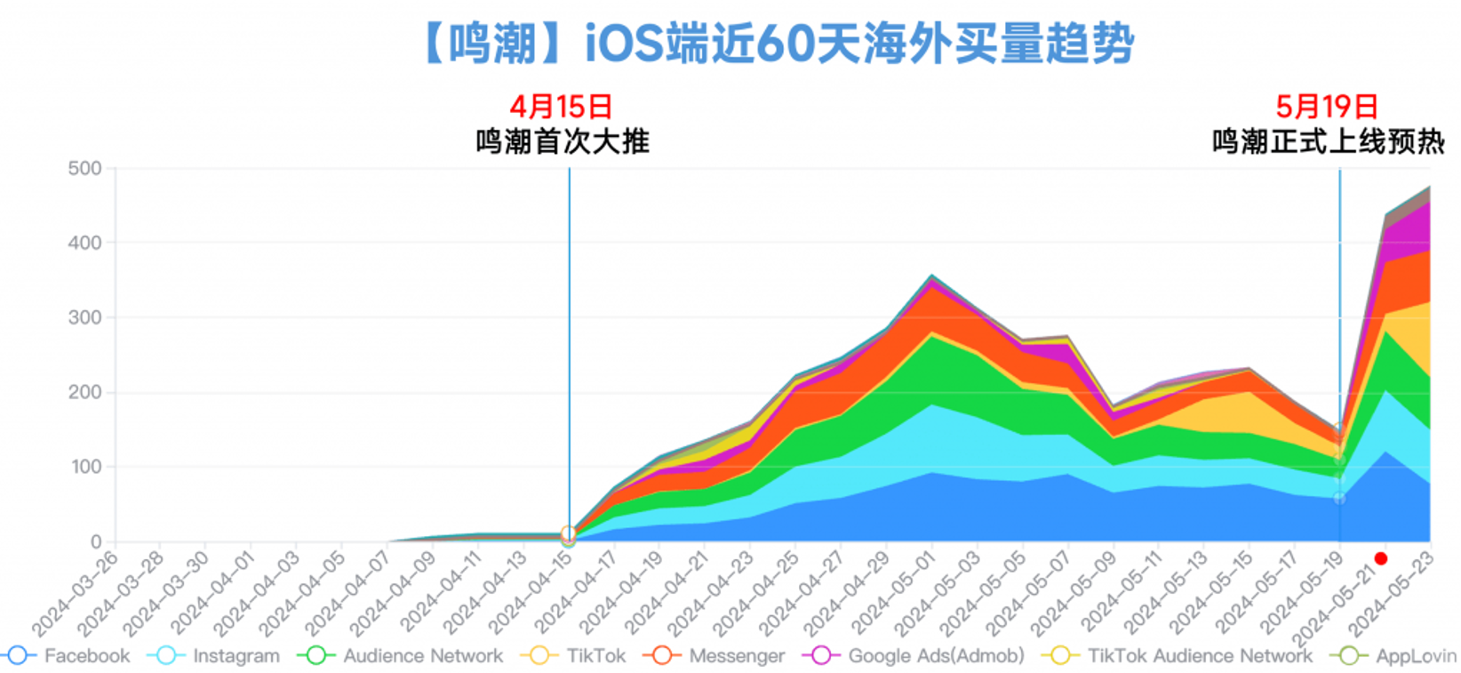 根据广大大的广告投放监测与专题分析,《鸣潮》从 2023 年就在海外有小规模广告投放记录,但在 2024 年进入公测期后明显放大广告投放:2024 年 4 月开始在 YouTube 投放,5 月在美区 TikTok 开启大规模投放,公测当月即冲上美国 App Store 动作类榜单并在上线月突破百万下载;广大大统计显示其累计创意量级与版本迭代非常高,并在出海广告投放榜单上连续上榜与攀升,成为2025上半年投放力度最大的二次元游戏之一。