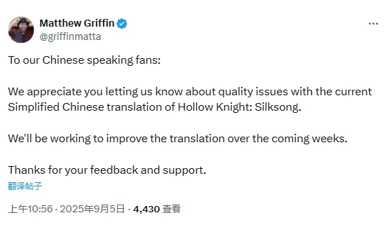 目前,《丝之歌》的制作团队 Team Cherry 已经在社交平台宣布,将在接下来几周改进中文翻译。