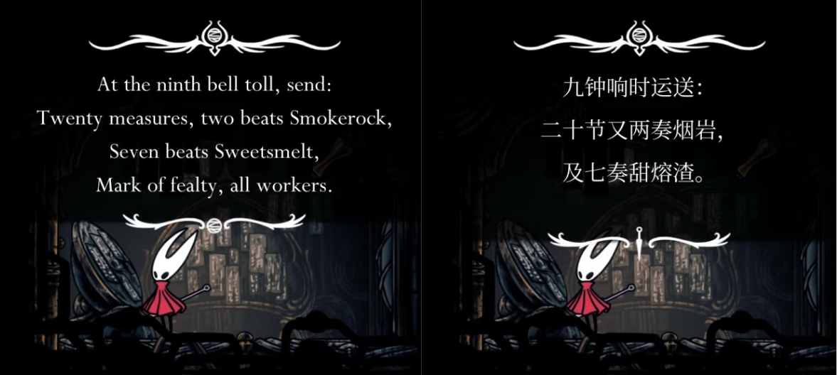 游戏英文采用类似哥特诗歌的表达方式,常用短句和残句营造神秘感,信息传达明确清晰。但在中文翻译之中,译者将这一风格错误表现为类“古风”式的辞藻堆砌,读起来十分拗口,与游戏的中世纪幻想风格并不符合。在此基础上又过度追求留白,导致信息难以顺利传达。