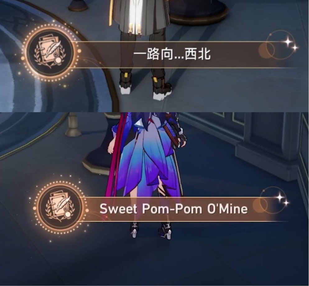 根据目标市场的流行文化做“等价”替换是一种可行的解决方案。例如在《崩坏:星穹铁道》之中,“一路向......西北”的成就来源于周杰伦知名作品《一路向北》。在英文翻译中,这一成就名称被替换成“Sweet Pom-Pom O'mine”,致敬经典摇滚乐队Guns N’ Roses的作品《Sweet Child O' Mine》。这两个致敬对象都在该语言的流行文化中有举足轻重的地位。